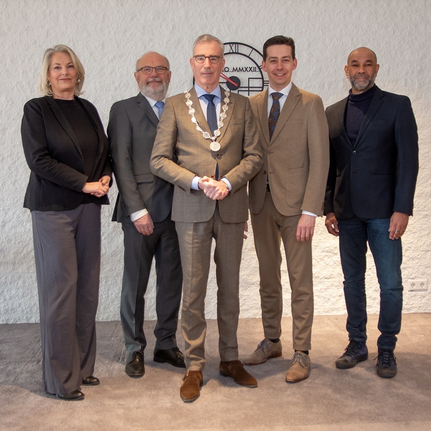 Foto: v.l.n.r. Gemeentesecretaris / algemeen directeur drs. Karin Wegewijs, Wethouder Jan Hazen, Burgemeester Pieter Heiliegers, Wethouder Ferry Hoekstra en Wethouder José de Robles