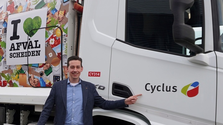 Foto: Wethouder Hoekstra (woonomgeving, duurzaamheid) bij een wagen van Cyclus, de nieuwe afvalinzamelaar voor gemeente Uithoorn. (Foto: gemeente Uithoorn)