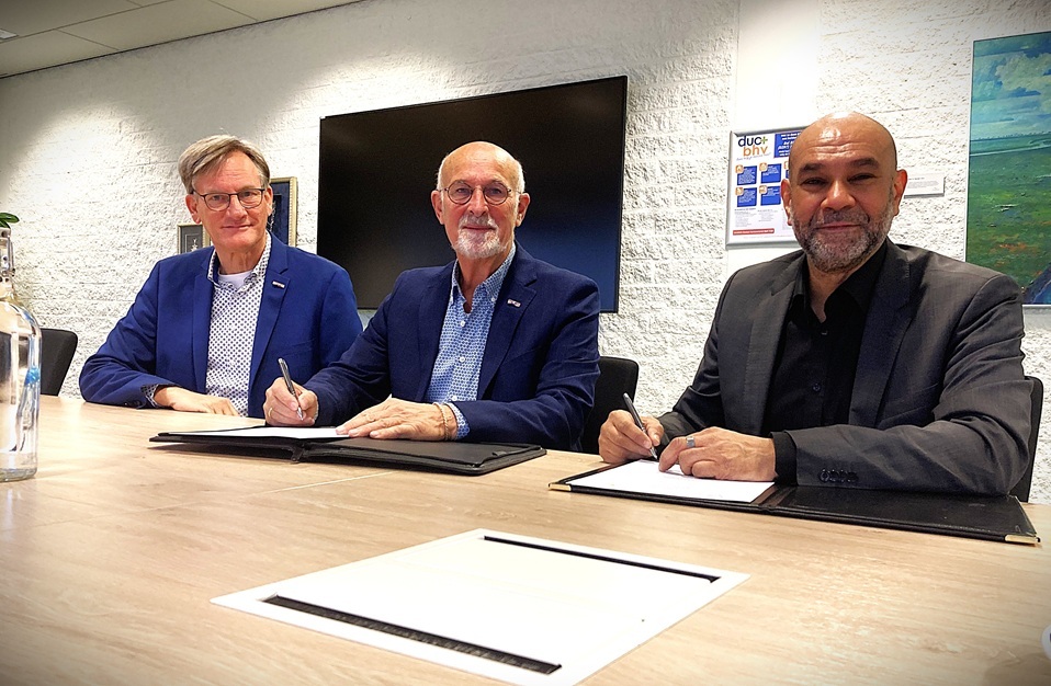 Foto: Wethouder De Robles (rechts) tekent met SUNU-voorzitter Peter Timmer (midden) en penningmeester Martin Joosse voor verdere samenwerking. (Foto: gemeente Uithoorn)