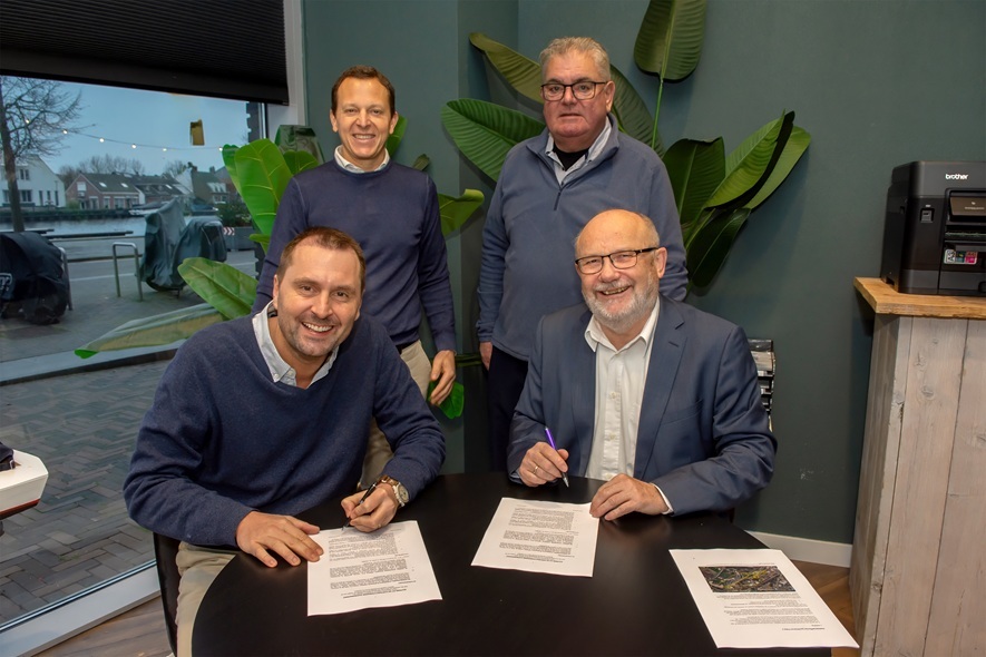 Foto: Jaap Schippers van E-Harbour (links) en wethouder Jan Hazen (rechts) ondertekenen de samenwerkingsovereenkomst voor uitbreiding van de jachthaven. (Foto: Patrick Hesse / VisionQuest)