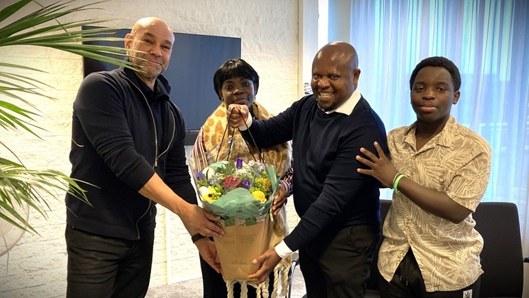 De heer Bukenya Muwanguzi ontving de felicitaties van wethouder José de Robles (Inburgering) en een prachtige bos bloemen in de Uithoornse kleuren blauw en geel. Zijn vrouw was meegekomen naar het gemeentehuis, samen met hun zoon, inmiddels eerstejaars Werktuigbouwkunde-student aan de Hogeschool van Amsterdam (HvA).